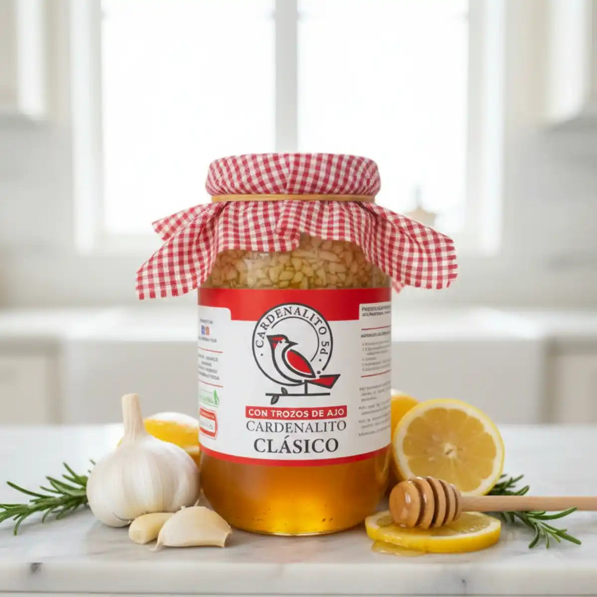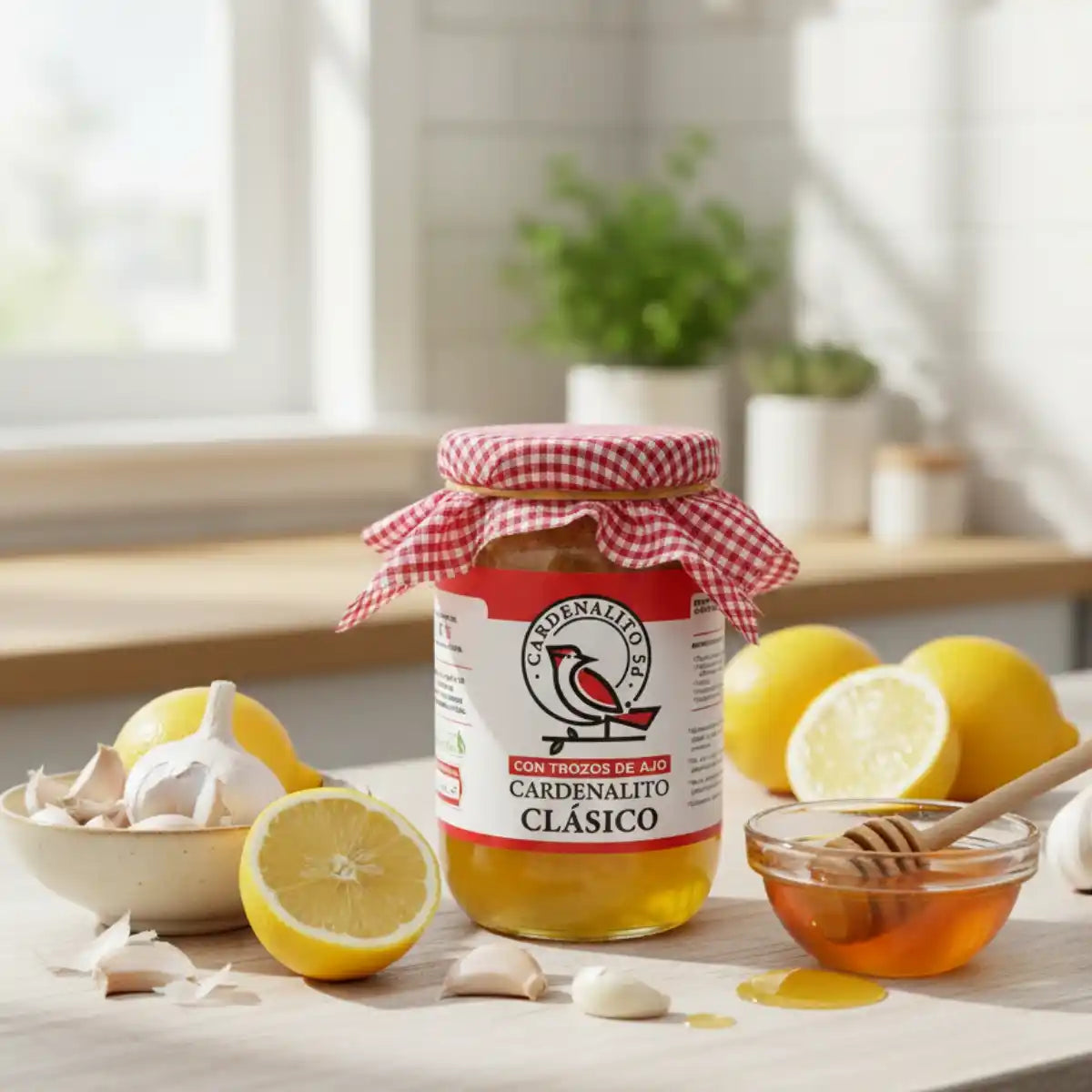 Cardenalito Clásico es un concentrado artesanal elaborado con miel, ajo, limón y cúrcuma, ingredientes de origen natural tradicionalmente utilizados en la alimentación cotidiana.
