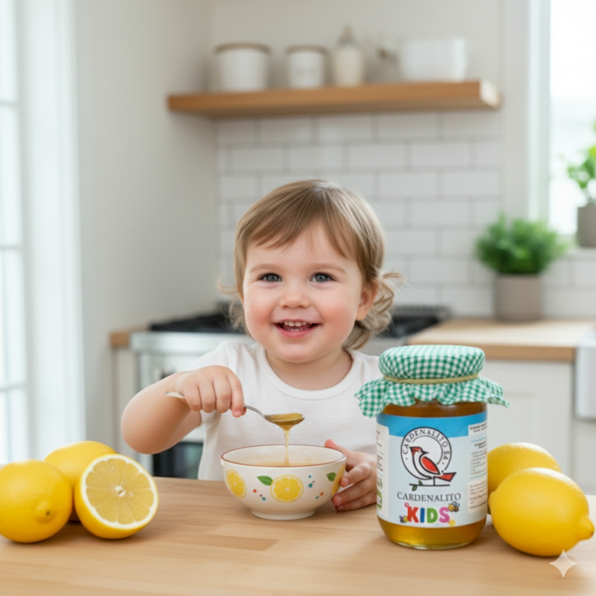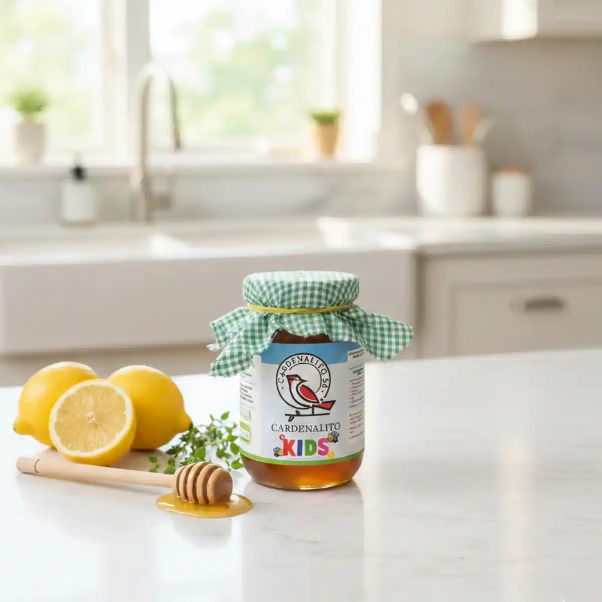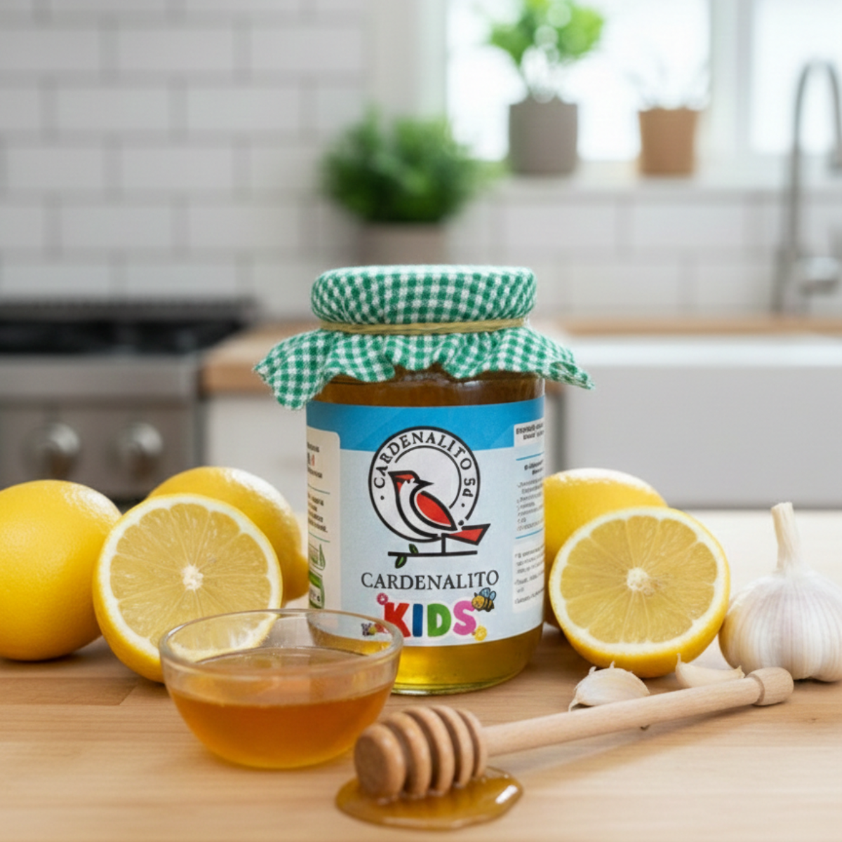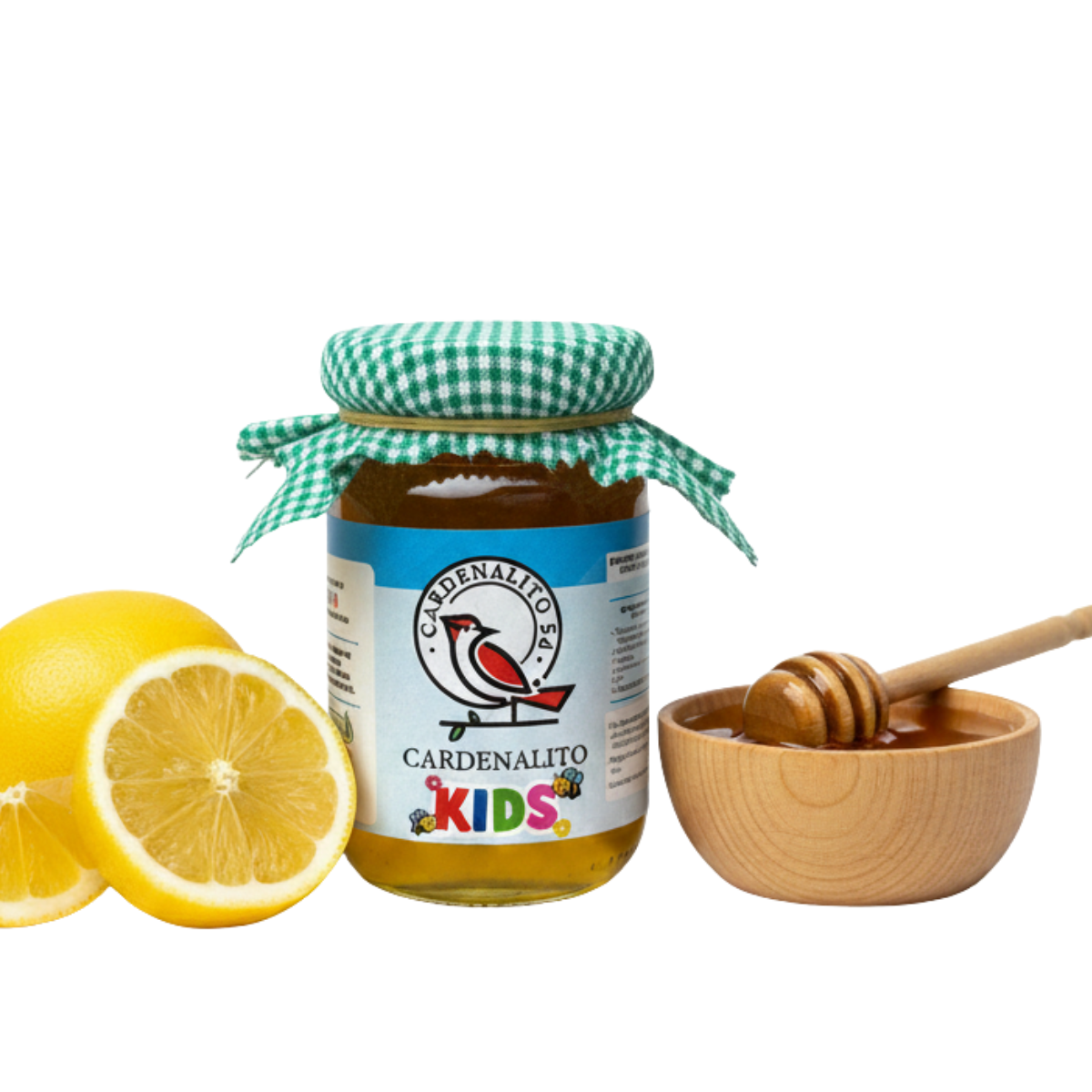 Cardenalito Kids es un concentrado artesanal natural elaborado con miel de abeja, ajo (sin trozos, solo extracto) y limón, pensado en los peques. Ingredientes de origen natural tradicionalmente utilizados en la alimentación cotidiana