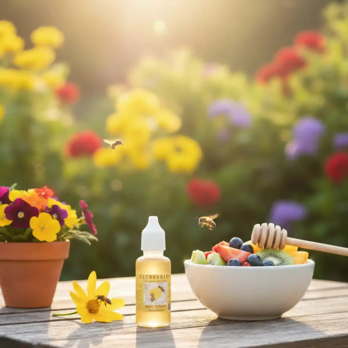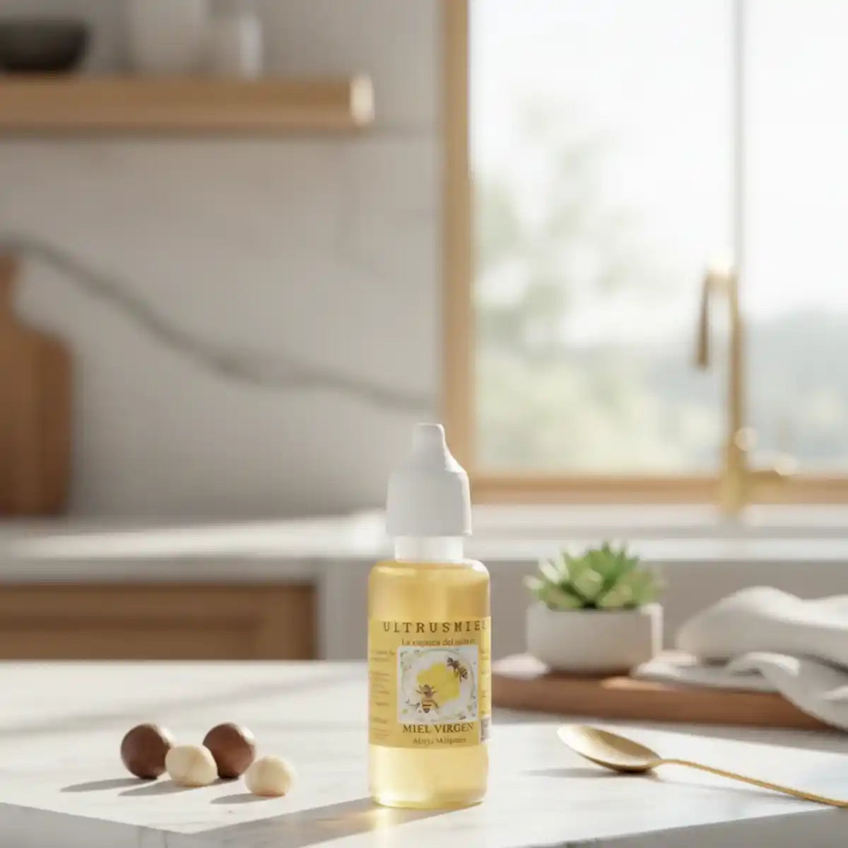 Miel de abeja melipona presentada en frasco plástico con sistema de aplicación por gotero. Producto artesanal elaborado en pequeños lotes con materia prima de origen natural.